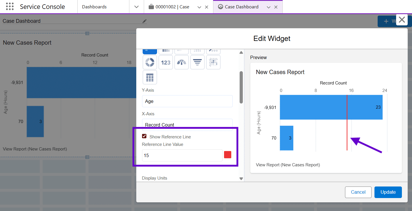 Vous vous souvenez quand les lignes de référence étaient réservées aux graphiques des rapports ? C’était frustrant de voir une ligne d’objectif sur le graphique d’un rapport, mais qu’elle disparaisse une fois le même graphique ajouté à votre tableau de bord.