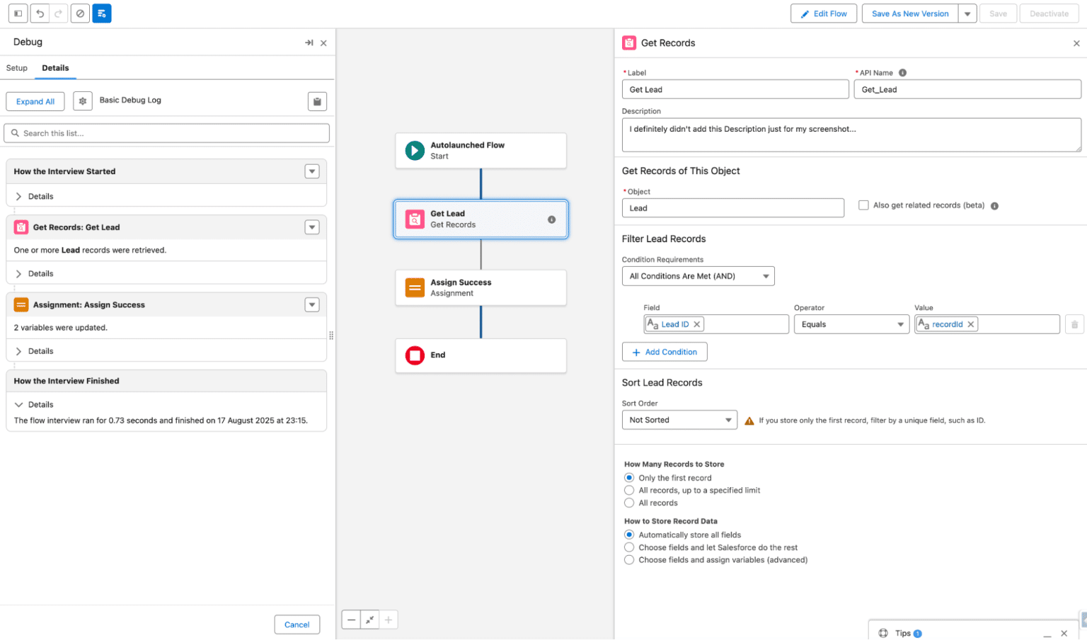 Avec la version Winter ’26, la première fois que vous cliquerez sur le bouton Déboguer dans un flux, vous remarquerez un changement immédiant : le panneau de débogage s’ouvre désormais sur le côté gauche de l’écran, et non plus à droite.